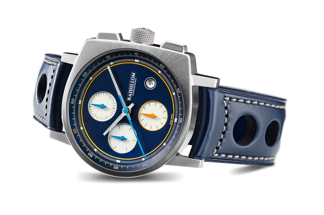 La forme incurvée, brevetée par Raidillon, est déjà devenue une icône de la marque. La montre incarne un style masculin sophistiqué ainsi qu'une fonctionnalité ultime. Cette unique montre en série limitée est présentée avec un bracelet fait main en Belgique en cuir de veau bleu surpiqué écru.