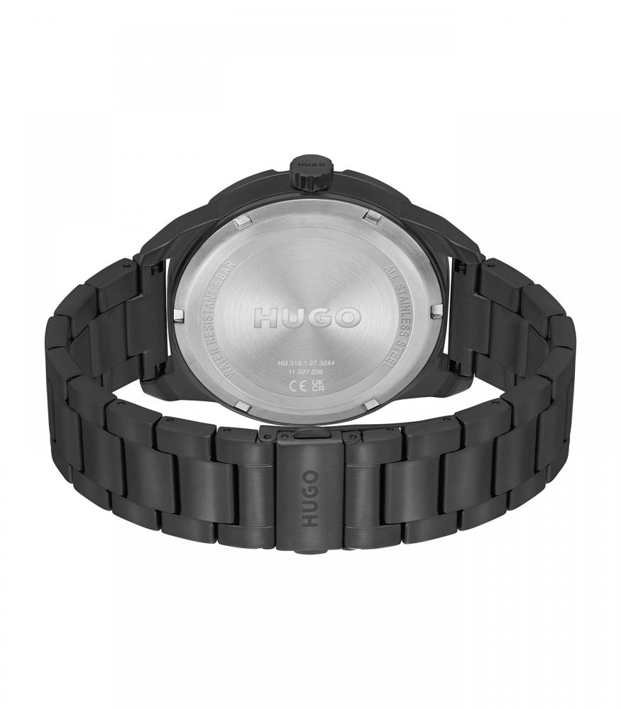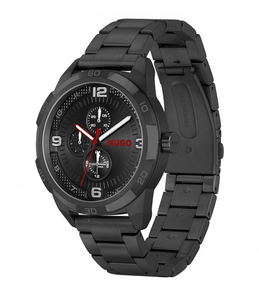 Une montre élégante en acier plaqué noir, signée HUGO. Pourvue d’un bracelet à maillons à effets brossés et polis, cette montre à trois aiguilles comporte un cadran noir doté d’une zone centrale de suivi des minutes, d’un anneau réflecteur en relief et de trois sous-cadrans pour un look multifonctionnel. Des chiffres arabes en gras complètent ce modèle.