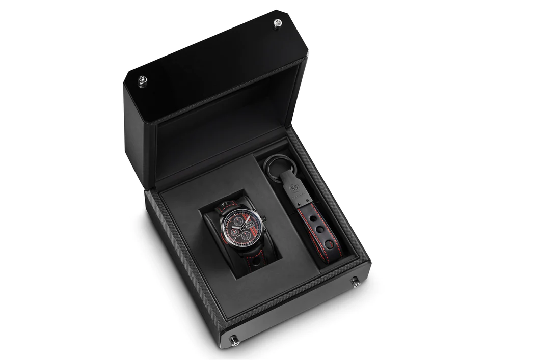 La montre est livrée avec le porte-clés Raidillon assorti aux couleurs du bracelet dans un écrin spécial Edition 22 ans.