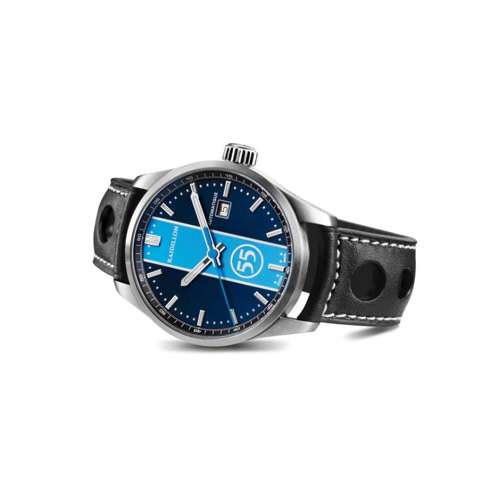 Cette montre automatique exclusive de 42 mm possède un cadran bleu acier brossé. L'iconique 55 de Raidillon se trouve au marqueur 30 minutes, la date à 3 heures. La bande bleue au milieu donne une vraie sensation de course.