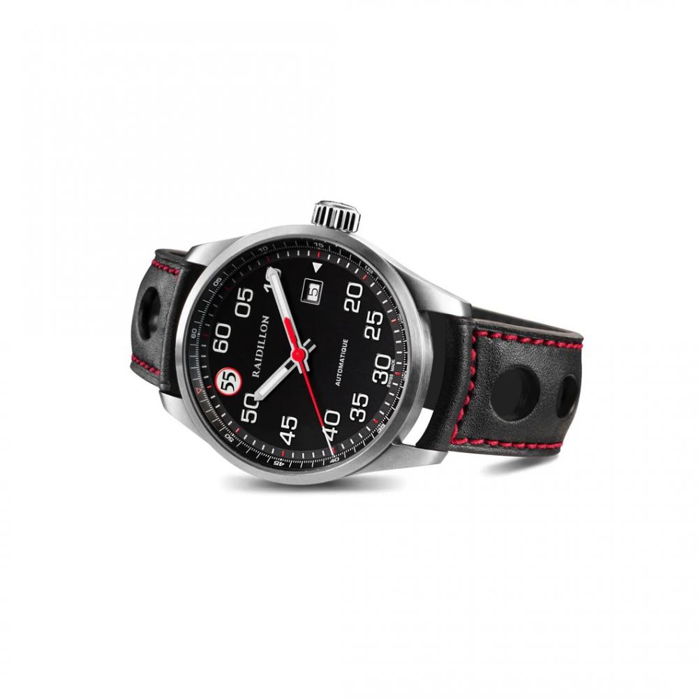 Cette montre automatique exclusive de 42 mm possède un cadran anthracite avec des remontées rouges. L'iconique 55 de Raidillon se trouve au marqueur 55 minutes, la date à 3 heures.