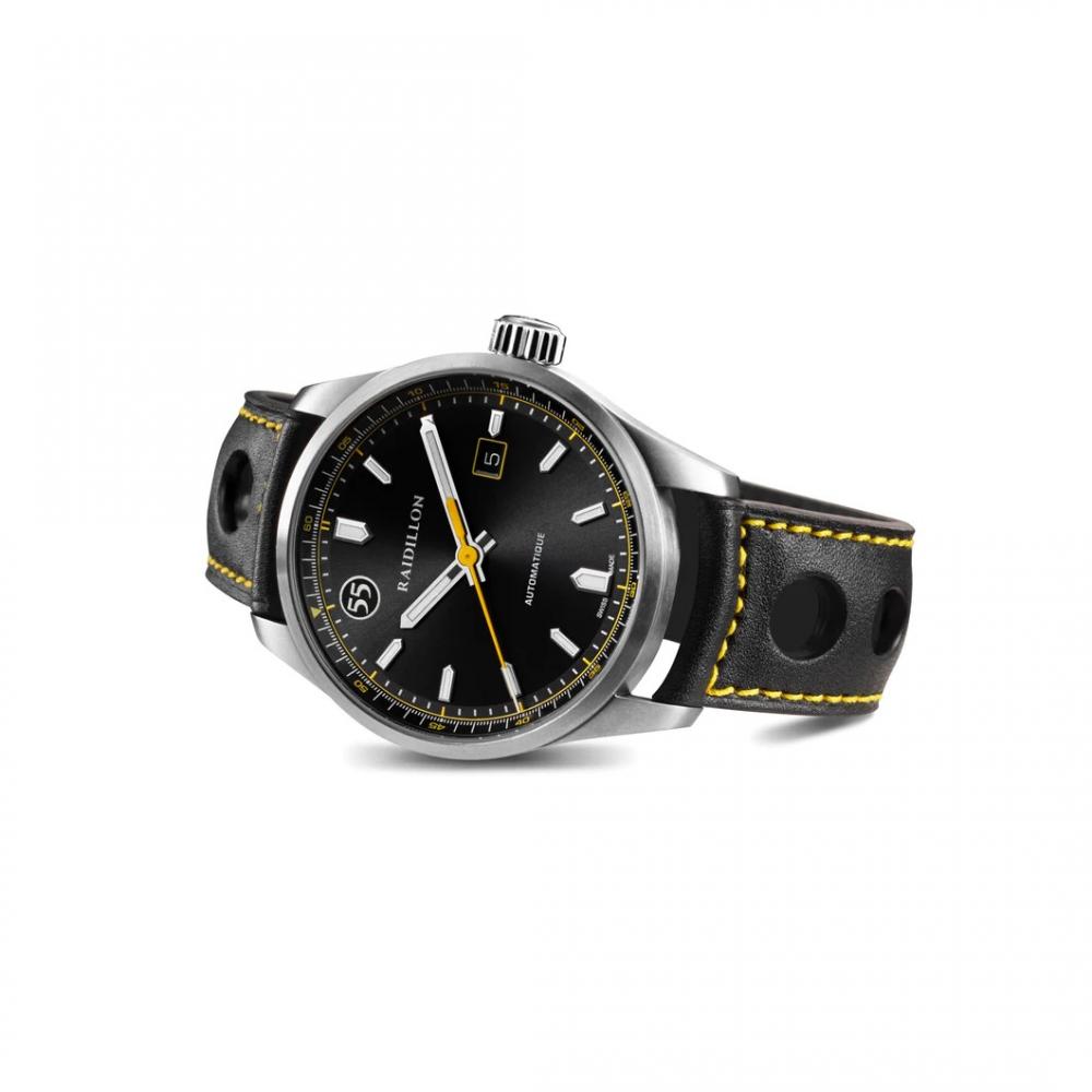 Cette montre automatique exclusive de 42 mm possède un cadran anthracite avec des remontées jaunes. L'iconique 55 de Raidillon se trouve au marqueur 55 minutes, la date à 3 heures.