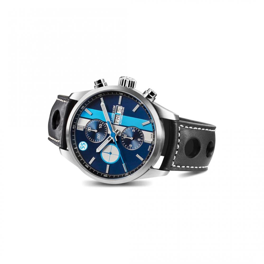 Ce chronographe exclusif de 42 mm incarne le design légendaire des voitures de course et possède un cadran bleu acier brossé avec 2 bandes de course. L'iconique 55 de Raidillon se trouve au marqueur 55 minutes, le jour/date à 3 heures.
