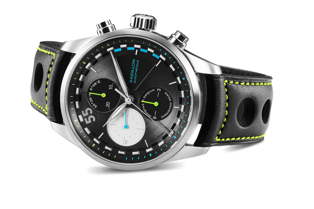 Ce chronographe 42 mm s'inspire du monde passionnant de la course automobile. Les détails sur son cadran rappellent les bandes rugueuses placées sur le bord des circuits pour guider les pilotes qui passent à une vitesse à couper le souffle. Le contraste entre les aiguilles jaune néon et turquoises crée un look moderne et dynamique. Cette montre de course est présentée avec un bracelet fait main en Belgique en cuir de veau noir rehaussé de coutures jaune vif.